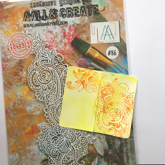 I cut two pieces of mixed media paper which are the same size as the cover of the little notebook I was going to use. I used a brayer and yellow and whit acrylic paint to add colour. Next I added Distress Oxide Ink in Carved Pumpkin onto the stencil, spritzed it with water and printed it onto my cover.